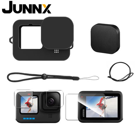JUNNX pellicola proteggi schermo in vetro temperato pellicola protettiva in Silicone Go Pro custodia con cordino per Gopro Hero 10 9 fotocamera sportiva nera